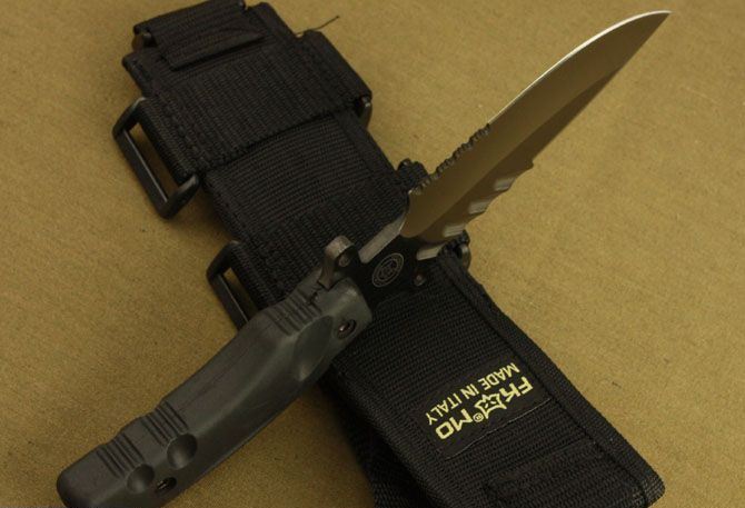 狐狸掠夺者格斗刀3号 全长:28.5cm 刃长:15.5cm 刃宽:4cm(最宽处) 刃厚:0.57cm 刃材:440C 硬度:57HRC 表面:镀钛 柄材:ABS 柄长:13cm 总重:520克(含刀套和包装物) 品质:高品质,刃口锋利