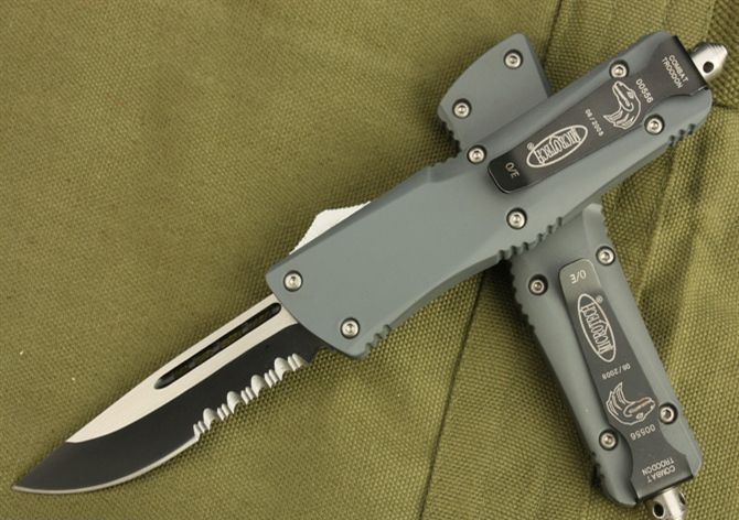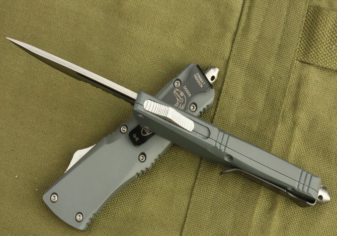 微技术.小号伤齿龙(灰色) 全 长: 22cm (含尾锥长度) 刃 长: 8.5cm 刃 厚: 3mm 刃 材: 440 硬 度: 58HRC 刀净重:150克 总重量: 260克(含包装物) 表 面: 黑钛(刀刃) 柄 材: 锌铝合金 刀 鞘: 尼龙 锁 闭: 弹簧直出 补充说明:直出弹簧刀的点头现象得到了很好的控制,出刀轻而快!手感好! 刀柄表面采用了喷塑处理,手感不错,刀柄采用锌合金铸造处理,硬度较高,稳定性较好。 配内外彩盒(双盒)包装,高档尼龙刀套。无说明书。