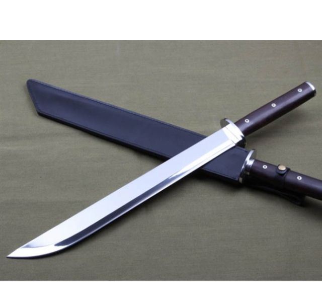 明朝锦衣卫佩刀 (镜光 尖头) 全 长:705mm 刃 长:475mm 柄 长:198mm 刃 宽:50mm 刃 厚:6.5mm 刃 材:5Cr13Mov 重 量:1700g(含包装) 硬 度:57HRC 表 面:镜光 柄 材:黑檀木 锁 型:定锁 其 他:配皮套