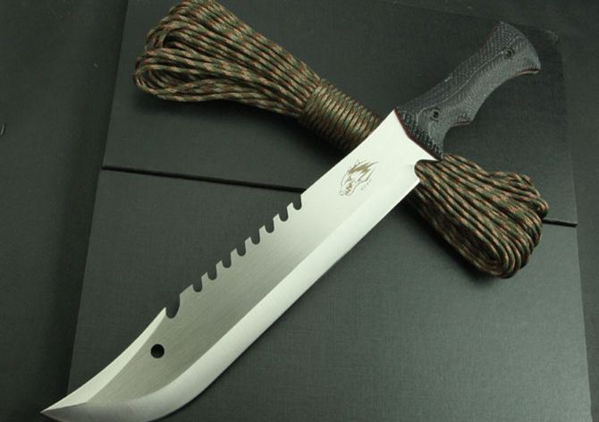 野狼大砍刀 全 长:445mm 刃 长:30mm 柄 长:125mm 刃 宽:60mm 刃 厚:6mm 刃 材:5Cr13Mov 重 量:1080g(含包装) 硬 度:56HRC 表 面:砂光 柄 材:米克塔 锁 型:定锁 其 他:配皮套和纸盒