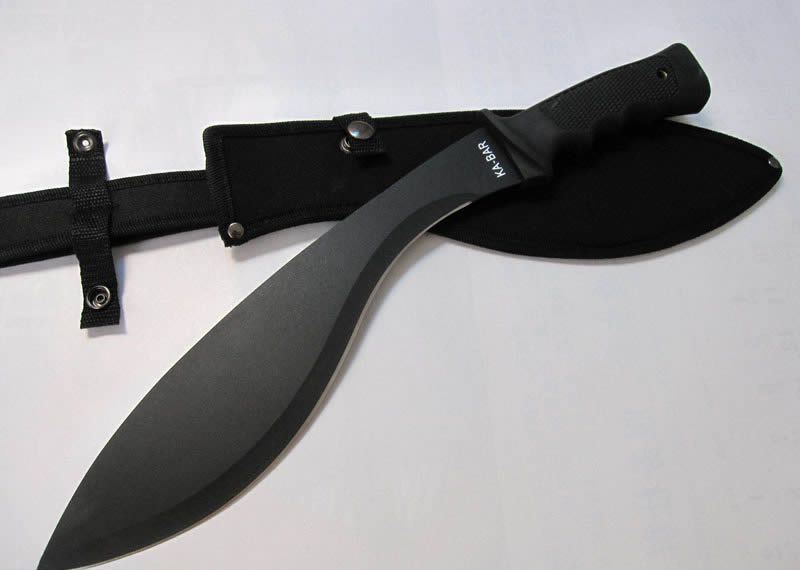 KA-BAR大狗腿砍刀 全长:44CM 刃长:31CM 刃宽:7CM (最宽处) 刃厚:0.3MM 硬度:56HRC 重量:600克(含套) 材质:420不锈钢 涂层:黑砂 柄材:塑胶,刀身贯穿至刀柄底部圆孔处 刀鞘:尼龙套
