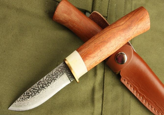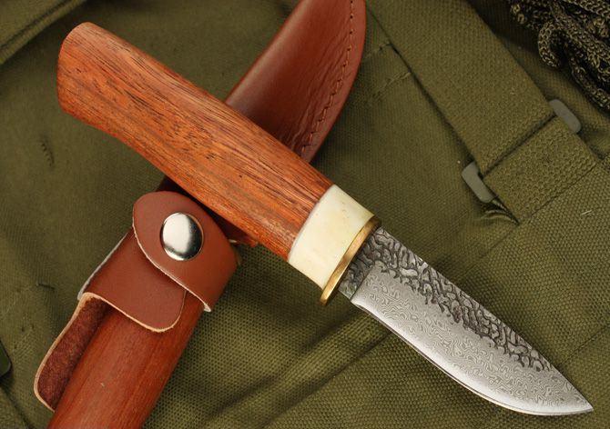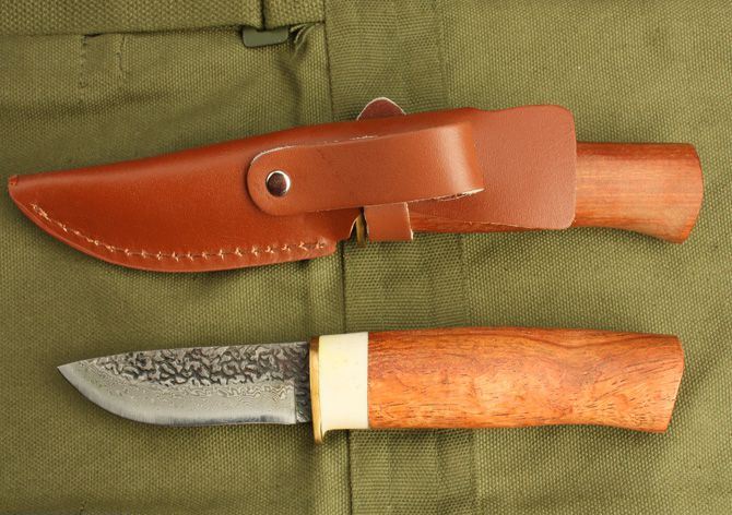 全 长: 21.2cm 刃 长: 8.5 刃 宽: 2.5cm(最宽处) 柄 长: 11.6cm 刃 厚: 0.32cm 刃 材: 花纹钢 硬 度: 58RHC 表 面: 锻打花纹和黑纹 柄 材: 兽骨+铜头+坚木 重 量: 130克(含套) 其 他:手工水磨,刃口锋利,可刮汗毛, 真皮刀套。
