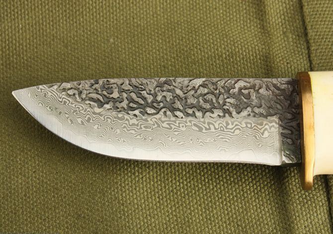 手工兽骨铜头防护刀(花纹钢) 全 长: 21.2cm 刃 长: 8.5 刃 宽: 2.5cm(最宽处) 柄 长: 11.6cm 刃 厚: 0.32cm 刃 材: 花纹钢 硬 度: 58RHC 表 面: 锻打花纹和黑纹 柄 材: 兽骨+铜头+坚木 重 量: 130克(含套) 其 他:手工水磨,刃口锋利,可刮汗毛, 真皮刀套。