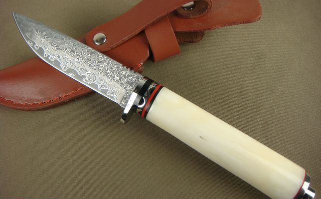全长cm:21 刃宽cm(最宽处):2.1 柄材:羊骨 刃厚cm:0.2 刃材:大马士革 净重g:120 总重g:140 刃长cm:9 硬度:HRC57 柄长cm:11.5 表面: 大马士革钢特有的花纹原色 包装:配礼品盒
