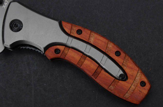 勃朗宁x47快开折刀 全 长:202mm 刃 长:88mm 柄 长:117mm 刃 宽:28mm 刃 厚:2.9mm 刃 材:5Cr15Mov 重 量:182g(含包装) 硬 度:57HRC 表 面:镀钛 柄 材:钢柄+红木 锁 型:快开 其 他:配彩盒