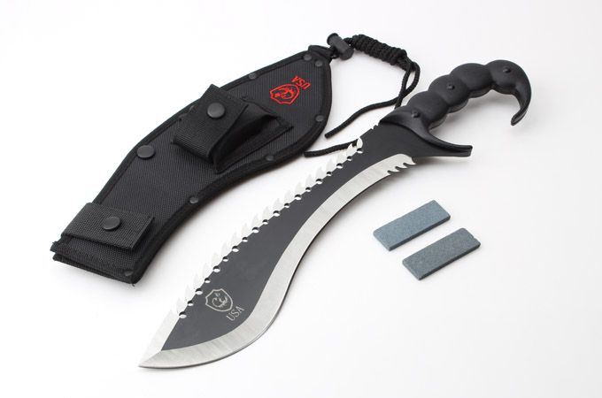 全 长:447mm 刃 长:300mm 柄 长:150mm 刃 宽:73mm 刃 厚:49mm 刃 材:8cr18mov 硬 度:59HRC 表 面:黑钛 柄 材:钢一体柄+G10柄 净 重:890克 毛 重:1081克(含包装) 其 他:配尼龙套和磨刀石2个USA代工版