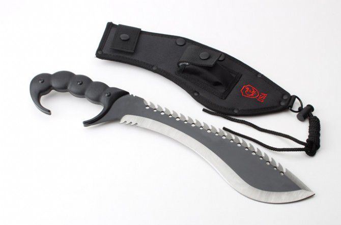 实用版毁灭者之蝎子王狗腿刀 全 长:447mm 刃 长:300mm 柄 长:150mm 刃 宽:73mm 刃 厚:49mm 刃 材:8cr18mov 硬 度:59HRC 表 面:黑钛 柄 材:钢一体柄+G10柄 净 重:890克 毛 重:1081克(含包装) 其 他:配尼龙套和磨刀石2个USA代工版