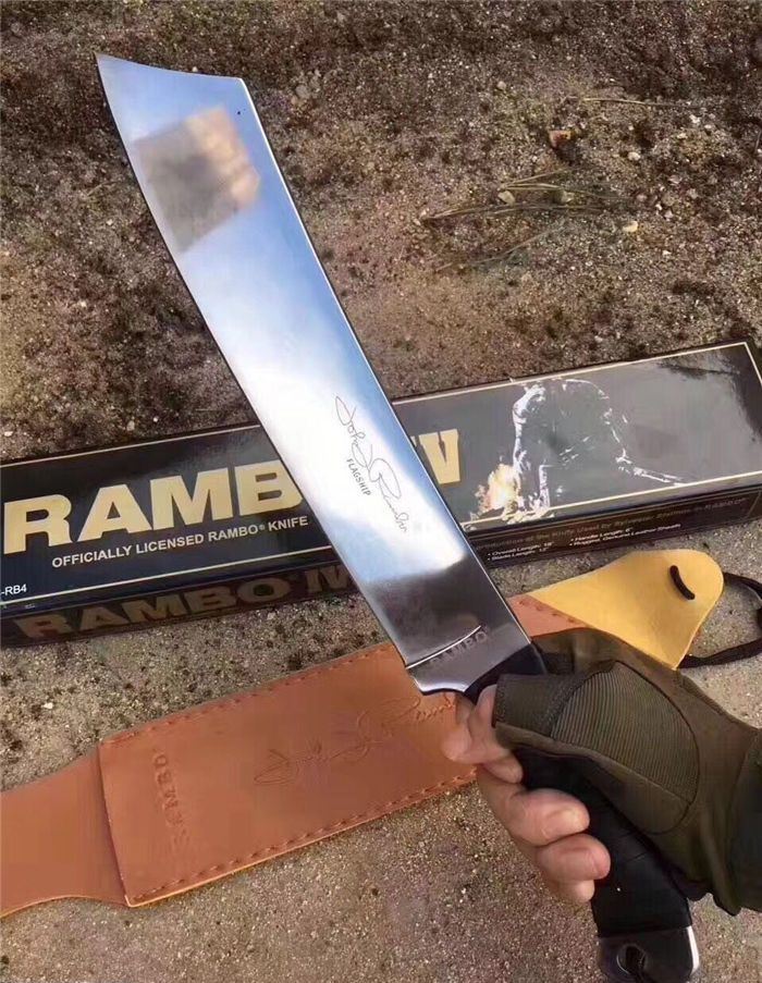 兰博4号手签纪念版(白) 全 长:420mm 刃 长:245mm 柄 长:135mm 刃 宽:62mm 刃 厚:5.5mm 刃 材:3Cr13Mov 重 量:760g(含包装) 硬 度:55HRC 表 面:镜面 柄 材:黑皮绳 其 他:配彩盒和人革皮套