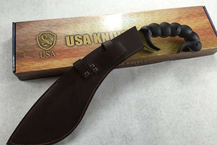 黄金蝎子战斗狗腿刀(皮套) 全 长:470mm 刃 长:300mm 柄 长:170mm 刃 最宽:70mm 刃 厚:6mm 刃 材:8cr18mov 净 重:1000克 毛 重:1500克(含包装) 硬 度:59HRC 表 面:拉丝+镀钛金 柄 材:钢一体柄+G10柄 锁 型:定锁 其 他:皮套