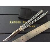 The One暴龙刃甩刀(骷髅迷彩柄) 全长:23.8CM 刃长:9.5CM 刃厚:0.3CM 刃材料:440C 刃硬度:58 柄材料:不锈钢压铸 重量:180克 刀鞘:刺绣高级尼龙套,可横竖挂皮带 The One暴龙款BM43, 经典Benchmade(蝴蝶)甩刀BM系列,由The one (唯一)精工打造,博弈刃型,暴龙背齿,整刀用铆钉铆合,省去螺丝难维护的特点,一体柄型更坚固和耐摔,骷髅迷彩,转动灵活,由THE ONE 出品,不可多得的精品甩刀