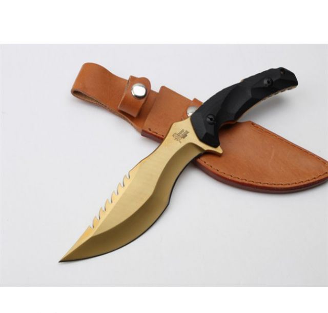 托德贝格终极斗士(黄金版) 全 长:290mm 刃 长:170mm 柄 长:123mm 刃最宽:46mm 刃 厚:5.5mm 刃 材:9cr18mov 重 量:595g(含包装) 硬 度:59HRC 表 面:镀钛 柄 材:钢一体柄+G10 锁 型:定锁 其 他:配牛皮套+牛皮纸盒子