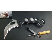 THE ONE超爱大白鲨爪刀 全长:17.3CM 折叠:13CM(护手处) 刃长:6(弧度直线量) 硬度:58-60(真空热处理) 表面:石洗 刃材:AUS-8 重量 135g THE ONE轻爪飞扬为各爪玩带来回归经典折叠爪之作-超爱大白鲨款,略微显胖的刃型,双环,完美的中心配比,一脉相承的妥帖手感,绝对是爪玩们2014年最值得入手的爪型 极具吸引力的爪型,犹如修罗手中惩罚之镰,独特镰刀式单面磨刃,大白鲨齿形棘齿型防滑螺丝,锁定等细节都匠心打造,这款经典中的精品会是您的THE ONE吗