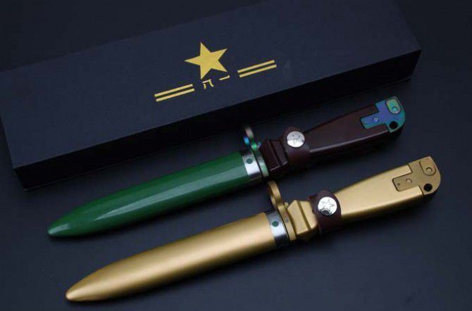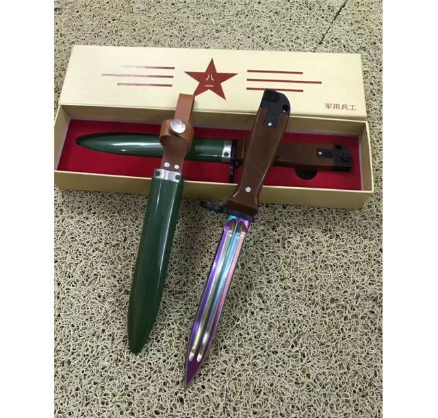 八一军剌幻彩、土豪金版 全 长:29.8cm 柄 长:12.8cm 刃 长:17cm 刃 宽:2.3cm 刃 厚:12mm 硬 度:60HRC 表 面:黄金色/彩钛 刃 材:军用钵 鞘 材:军用ABS 柄 材:电木+钢 总 重:320g