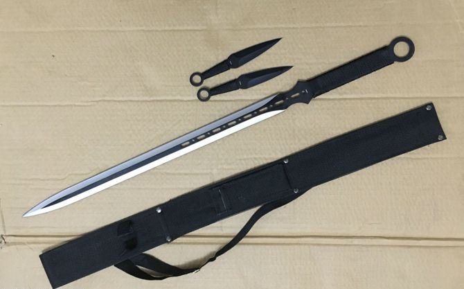 双镖忍者(白刃)忍者战刀 全 长:68.5cm 刃 长:47cm 刃 宽:3.2cm(最宽处) 刃 厚:3mm 柄 长:16.5cm 表 面: 发黑 刃 材: 440 硬 度: 56HRC 柄 材: 绑绳 重 量:500克(含尼龙套、飞镖) 包 装:尼龙套 飞镖尺寸 长:16.5cm 宽:2.5cm 刃 厚:2.8mm 刃 长:8.5cm 柄 长:7cm 表 面: 发黑 刃 材: 440 硬 度: 56HRC 柄 材: 绑绳 重 量:37.6g