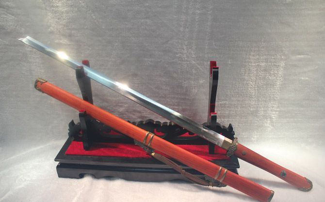 红木唐刀(长款) 全长 (cm):102 刃长(cm):77 柄长 (cm):23 全重(g):1.400 鞘重(g):420 刃宽(cm):3.2 刃厚(cm) :0.75 刃材: 高碳钢 鞘材: 红木 装材: 合金 柄材: 红木 硬度:58 性能:全开刃,削纸断竹砍铁 加工工艺:精炼地基钢,手工锻打,传统古法研磨。13道研磨 备注:手工产品存在误差,规格仅供参考,请以实物为准