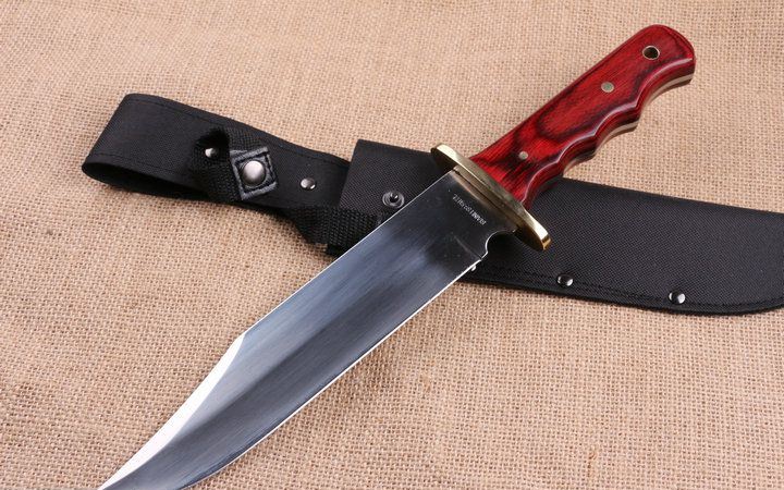 红蟒猛兽新品直刀 全 长:351mm 刃 长:218mm 柄 长:133mm 刃 宽:43mm 刃 厚:4.0mm 刃 材:7Cr17 重 量:518g(含包装) 硬 度:58HRC 表 面:拉沙+镜光 柄 材:铜头护手+大红木 其 他:配优质牛津套
