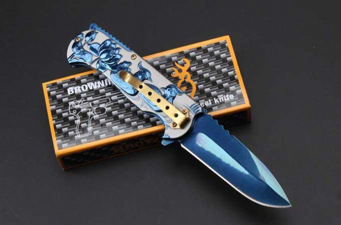 勃朗宁浮雕鸳鸯戏水折刀(蓝钛版)