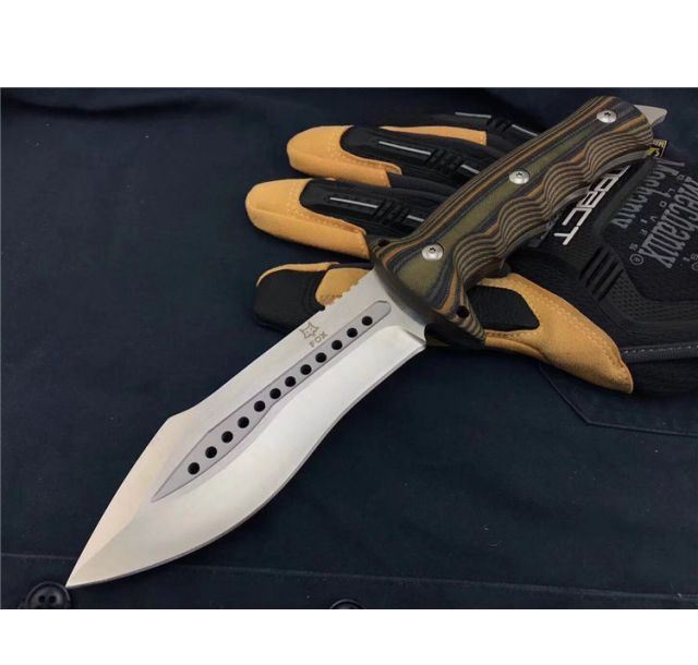 狐狸FOX千眼直刀 全长:28.3cm 刃长:14.1cm 柄长:14.2cm 刃厚:0.45cm 刃宽:4.6cm 刃材:8CR18MOV 柄材:双色G10 硬度:58HRC 净重:560克(含包装) 锁定:直锁 表面处:沙光 其他:礼品盒和优质皮套
