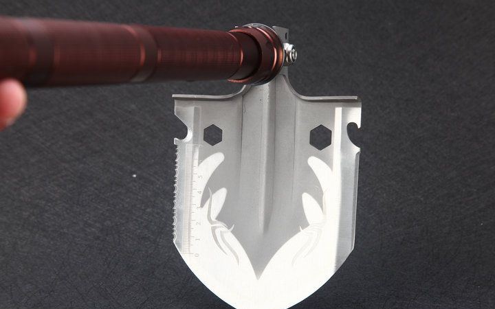 伸展长度:58.5cm 折叠长度:43.7cm 锹面尺寸:14.5*12.5cm 刀刃长度:6.5cm 厚度:2.1mm 重量:950约g (含包装物) 刃材:进口不锈钢 柄材:加厚航空铝材+啡色 包装:迷彩牛津布袋子,可挂腰上 特点:手柄拉分开三折,方便外出,安装简便 功能:有铲,锄 ,锯,刀,开瓶器,打火棒,撞击器,一字十字螺批等功能,在生产工艺上采用上好淬火高碳钢,增加强度,抗磨损,抗腐蚀,耐高温等优势.有把铲在手,登山,外出永不怕