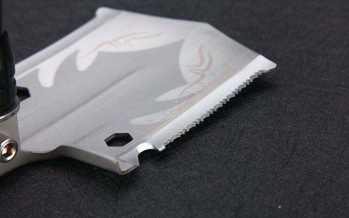 功能:有铲,锄 ,锯,刀,开瓶器,打火棒,撞击器,一字十字螺批等功能,在生产工艺上采用上好淬火高碳钢,增加强度,抗磨损,抗腐蚀,耐高温等优势.有把铲在手,登山,外出永不怕