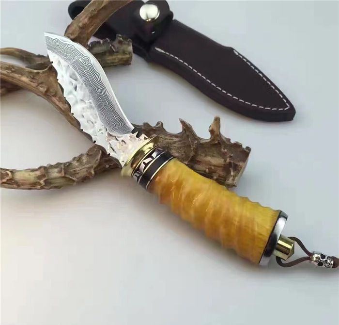 刀刃为锻打大马士革钢、刃背手工打刻鱼骨齿、手柄尾部采用天然黄羊角+骷髅头吊坠