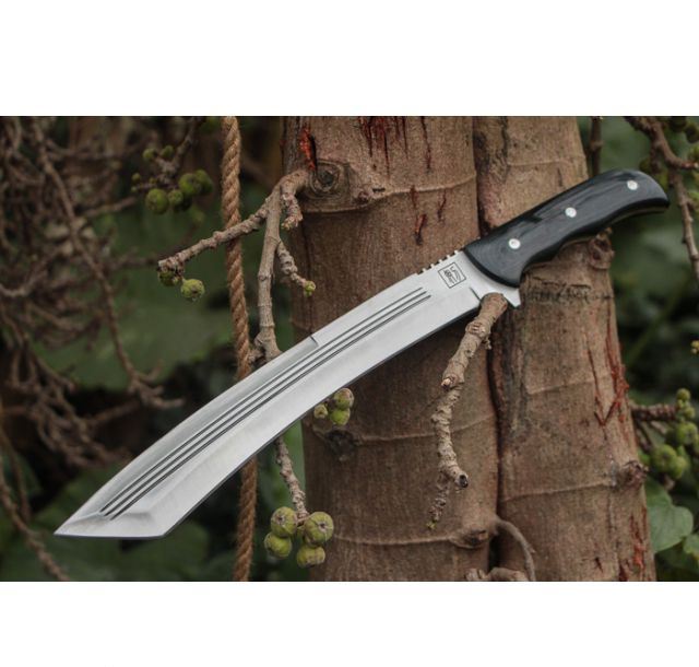 柄 材: 刀身贯穿刀柄,三口坚实的钢钉铆住两面黑木