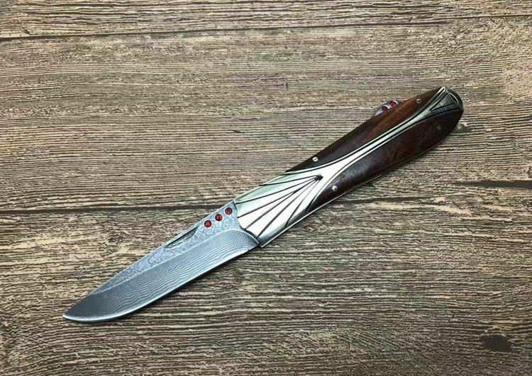 大号小红星大马士革折刀 全 长: 19.8cm 刃 长: 8cm 刃 宽: 2.2cm(最宽处) 闭 合: 11.7cm 硬 度: 59HRC 刃 厚: 0.25cm 重 量: 246克(含包装) 包 装: 高档木盒 表 面: 纯手工制造 刃 材: 大马士革 柄 材: 仿红宝石水晶+黄铜+红影木 锁 闭: 背锁 其 他: 刃口锋利 大马士革钢花纹和把手木纹及颜色各异,以实物为准