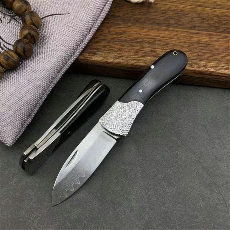 银河大马士革折刀 全长:14cm 刃长:6.5cm 刀刃:大马士革钢 厚度:2mm 硬度:59HRC 手柄材料:锻打凹凸钢头+黑檀木