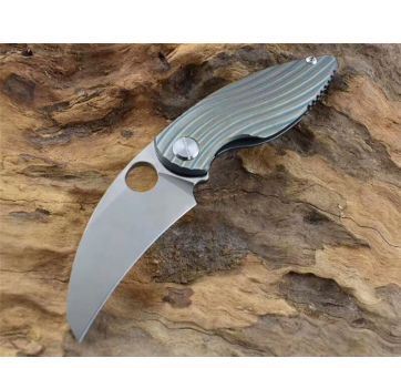 新彩色翠鸟钛柄折刀 全长:150mm 刃长:65mm 柄长:90mm 刃宽:25mm 刃厚:4.8mm 刃材:D2钢 重量:192克 硬度:59-60HRC 表面:沙光 处理材料:TC4钛合金+带轴承滚珠
