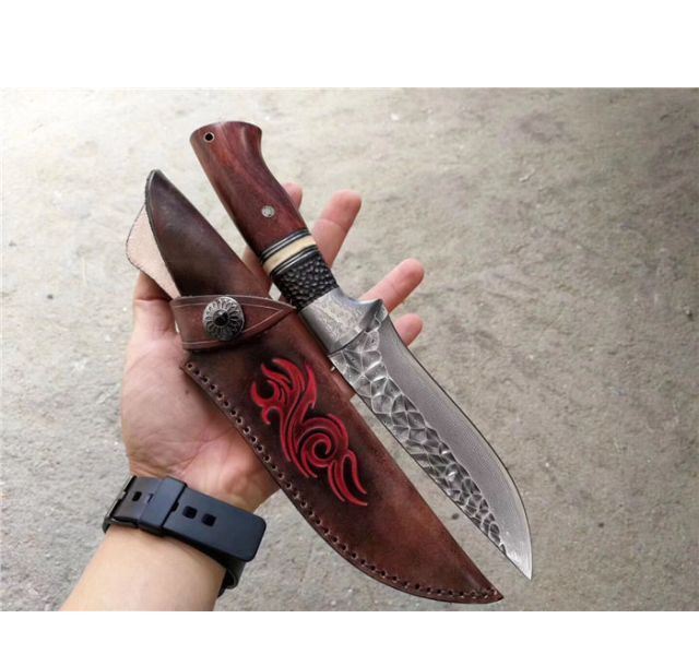 忍者大马士革直刀 全长:275mm 刃长:145mm 刃厚:4.3mm 刃宽:40mm 柄长:130mm 刃材:进口VG10芯大马士革钢 净重:约260g 硬度:58-59hrc 柄材:巴西花梨木+猛犸象牙+非洲黑檀 皮套:手工压花进口植鞣牛皮鞘