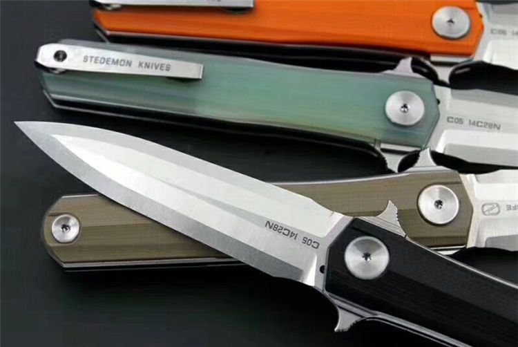 C05双刃折刀砂光 全长:215MM 刃长:84MM 刃厚:3.8MM 刃材:14C28N 重量:133克左右 柄材:G10 轴承:KVT钢珠 颜色:黑色,透明,橙色,沙漠 刃面:砂光