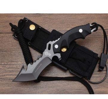 影子之峰直刀 全长:24.8CM 刃长:12.1CM 刃厚:0.49CM 刃宽:382CM 刀刃材质:8Cr17Mov 硬度:58HRC 柄材:G10 刀鞘:黑色尼龙战术绑腿刀鞘纸盒哨子打火棒附带罗丝刀 重量:465克含包装