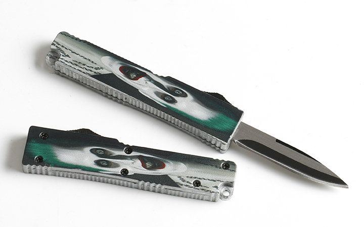 微技术明星迷你单锋直弹刀 全长:13.0cm 刃长:5.0cm 刃厚:1.9mm 刃材:440 硬度:57HRC 刀净重:52.0克 总重量:60.0克(含包装物) 表面:拉丝伴黑色(刀刃) 柄材:锌铝合金 刀鞘:无 锁闭:弹簧直出