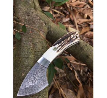 大马士革小袋鼠直刀 全长: 15.2cm 刃长: 5.2cm 刃宽: 2.5cm(最宽处) 柄长: 10cm 硬度: 58HRC 刃厚: 0.25cm 重量: 100克 表面: 纯手工制造 刃材: 大马士革 柄材: 鹿角 全手工精心打造经典中的经典高端鹿角香刀,每一款鹿角都不一样、以实物为准
