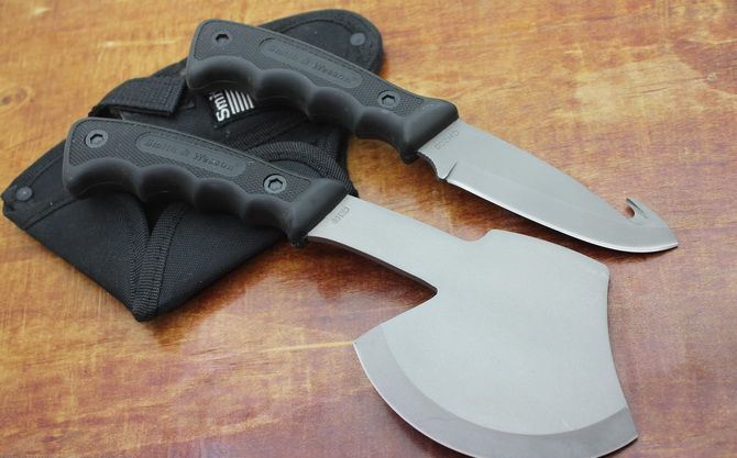 史密斯威森野营二宝 类型:短匕 款式:史密斯威森 全长:23cm 刃长:9cm 刃厚:0.3cm 刃宽:3cm 柄长:13cm 柄材:ABS 材料:440C 硬度:58HRC 净重:150g 表面处理:喷砂 产地:国内代工 类型:斧头 款式:史密斯威森 全长:28cm 刃长:11cm 刃厚:0.5cm 刃宽:9.5cm 柄长:18cm 柄材:ABS 材料:440C 硬度:58HRC 净重:300g 表面处理:喷砂 产地:国内代工