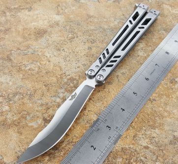 theone瘦子蝴蝶甩刀 全长:25.4CM 刃长:11.11CM 刃厚:0.3CM 刃材:440C 柄长:14.3CM 柄厚:1.06CM 刃表面:沙光 重量:147克 theone纯钢打造,全数控精确机加工,雕刻镂空柄,轴套系统转轴,打造一流蝴蝶甩刀