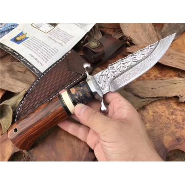 大马士革竹仙直刀 全长:27cm 刃长:13.5cm 柄长:13.5cm 刃最宽处:3.8cm(最宽处) 刃材:高硬度大马士革VG10钢 硬度:59-60HRC 柄材:稳定固化颜色木+黄檀木 手工缝制精致皮套采用高端稳定固化颜色木+黄檀木手柄、大马士革VG10钢心,手工缝制精致皮套