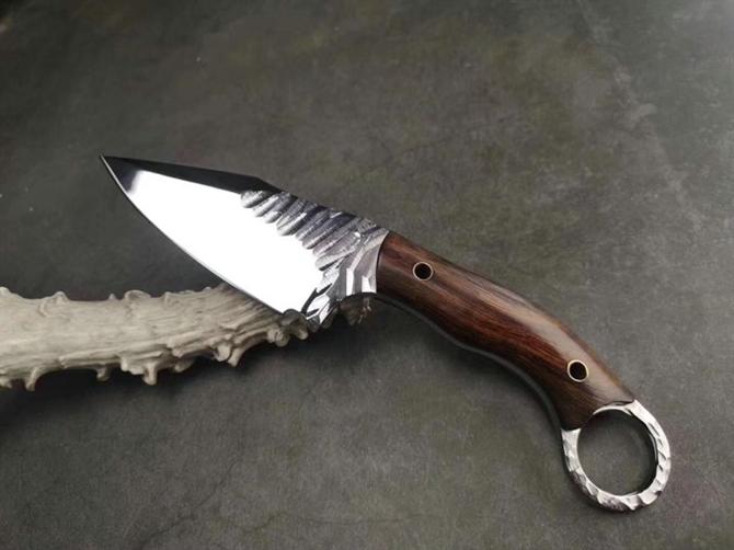 刀刃采用瑞典进口山特维克12C27钢,手工精细研磨,V口打磨抛光镜面效果,刀柄用沙漠铁木,搭配手工缝线刀鞘,植鞣牛皮镶嵌蟒蛇皮精心精工制作