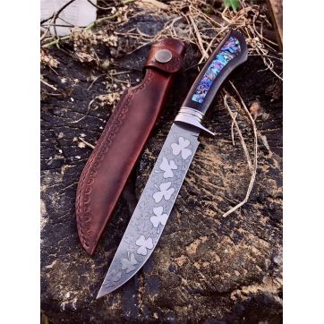 宁乐手工三叶草直刀 全长:24.3cm 刃长:13cm 柄长:11.3cm 刃宽:2.6cm 刃厚:0.4cm 钢材:VG10 柄材:黑檀木镶天然鲍鱼壳 硬度:60HRC 配:手工缝制皮套