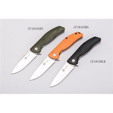 长风熊头1810快开折刀 类型:轴承快开 刀刃:5Cr15MoV HRC:56±1o 刃厚:3.0mm 表面:沙光 手柄内衬:2.0mm不锈钢减重内片 手柄:黑色G10\绿色G10\色G10 刃长:88mm 总长:195mm 重量:115g