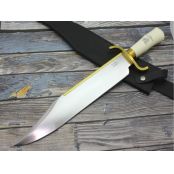 敢死队大号龙格尔金背大博伊刀 全长:51.5cm 刀刃:34.5cm 刃厚:0.55cm 刃宽:6cm 材料:D2钢材 硬度:59HRC+ 柄长:14.5cm 重量:1550克(包含皮套) 随附高档黑色牛皮刀套,金背护手使用高精密cnc制作,手柄材料选用象牙白塑胶压制,图案石墨制作,整体成品细节比样板更好,无缝隙