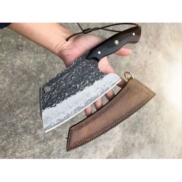 强悍型砍切坦克菜刀 总长:27.2cm 刃长:18cm 刃厚:4mm 刃宽:8.8cm 钢材:日本进口锻造VG10大马士革钢 硬度:60-62HRC,真空热处理 表面效果:复古工艺保留锻造捶打纹理 柄材:进口黑檀木 皮套:意大利进口手工大师纯手工制作雕花缝线植鞣皮 包装:手工盒子礼盒内衬EVA,如此好用一把强悍型砍切菜刀,不要错过机会哦