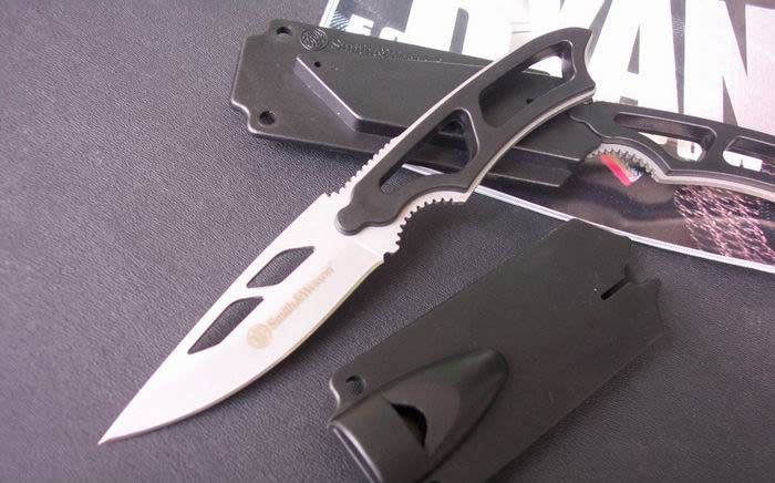 史密斯SW990哨兵刀(哨子刀) 全 长: 17.5cm 刃 长: 8cm 刃 厚: 2.5mm 刃 材: 440 硬 度: 56HRC 表 面: 喷灰砂 柄 材: ABS工程塑料 刀 鞘: ABS 工程塑料 重 量: 60克